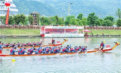 此次龙舟赛采用两两对决方式,两支龙舟队分上下午各赛一场,最终取两场比赛中累计时间最少的队伍获胜。在现场围观的数千名观众的呐喊声、欢呼声见证下,参赛选手们登上龙舟划入赛道,摩拳擦掌、意气风发。随着裁判员按下汽笛,两艘龙舟犹如出海的蛟龙,齐齐翻波涌浪,争相向前跃去。龙舟上,鼓手身体前后摇摆,紧握鼓槌抡起两臂,在鼓面上敲打出前行的节奏,众桨手则跟随着鼓点,口中吆喝声阵阵,手中桨板翻飞、水花四溅。飞舞的龙旗,飞驰的龙舟,与岸上欢乐的人群相映成趣,现场气氛热烈,构成了一幅龙舟竞渡的民俗风情画。